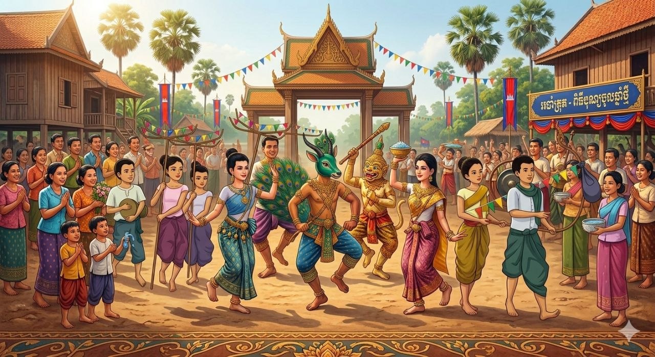 衣装は非常に特徴的で、仮面をつけたり、独特なメイクを施したりして、精霊やさまざまな役柄を表現します。音楽にはカンボジアの伝統楽器が使われ、活気と神秘的な雰囲気を生み出します。
